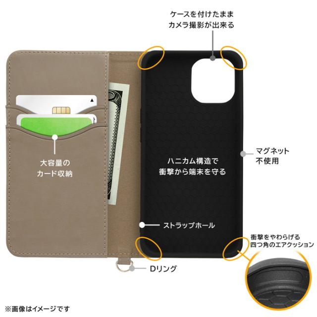 表情のあるむら染めPUレザーとトープ色のPUレザーを組み合わせた、『ディズニーキャラクター』のデザインがプリントされた手帳型iPhone 15 用ケース。