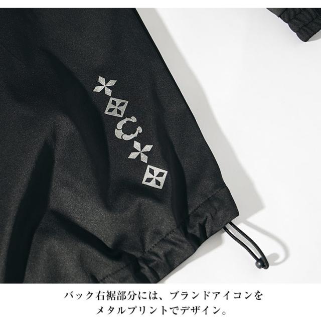襟の内側とバックの右裾に5つのブランドアイコンをそれぞれラバーとメタルでプリント。