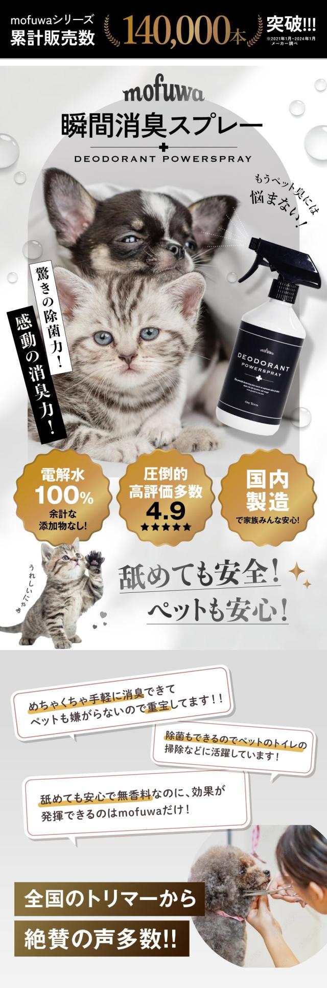 公式 mofuwa 瞬間消臭スプレー 犬 猫 ペット 消臭 除菌 剤 トイレ おしっこ うんち 猫砂 糞尿 アンモニア 舐めても安心 無添加 無香料 日本製 500mlボトル もふわ モフワ