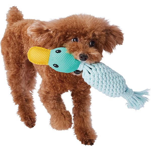 ロープとメッシュ生地の組み合わせで噛んで遊んでしっかり歯みがき!頭とお腹は笛入りだから、夢中でカムカム!