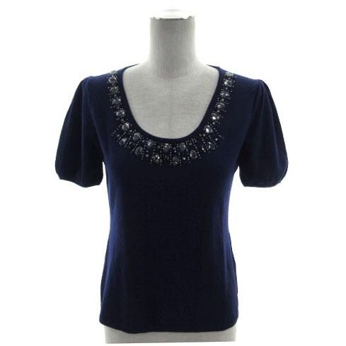 【中古】マテリア MATERIA ニット セーター Uネック ビジュー ビーズ 半袖 ウール混 ネイビー系 紺系 38 レディース