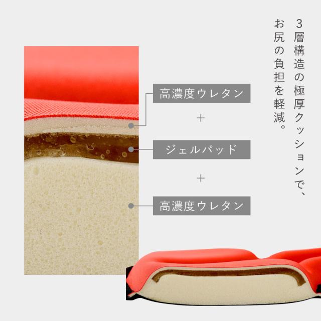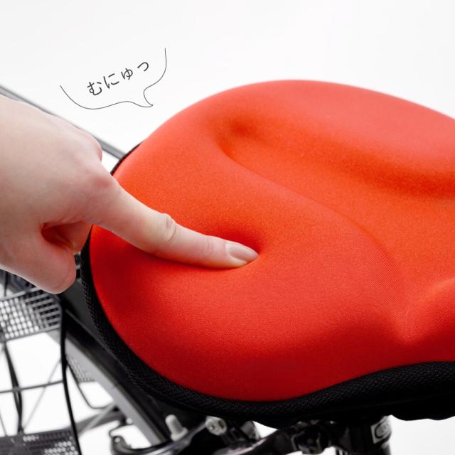 ふかふか極厚クッションでお尻が痛くなりにくい自転車用サドルカバー。高濃度ウレタンでジェルパッドを挟んだ3層構造。極厚クッションで衝撃を吸収して、長時間自転車に乗ってもお尻の負担を軽減します。