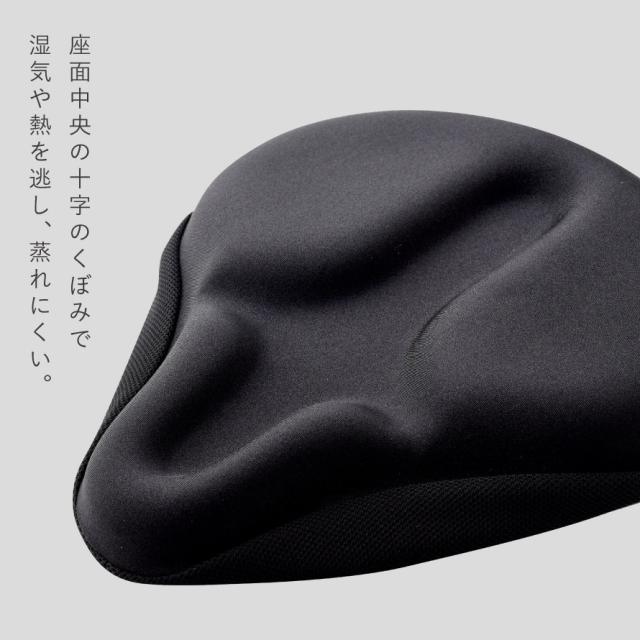 座面中央の十字のくぼみで湿気や熱を逃し密着や圧迫を防ぎます。蒸れにくく快適です。