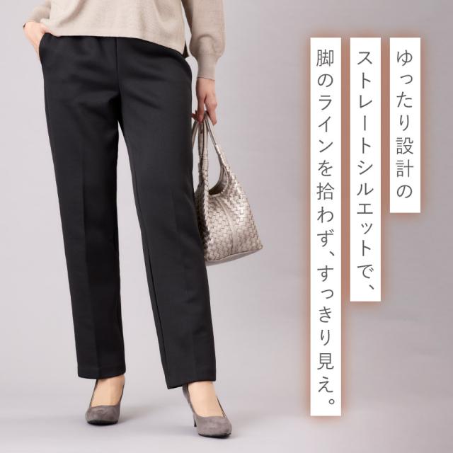 ゆったり設計のストレートシルエットで脚のラインを拾わず、すっきり見え。長時間の着用でも締め付け感がなく、家事やお出かけ、ウォーキングにもおすすめです。