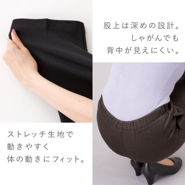 ウエストは総ゴム仕様でお腹まわりもラクちん。しゃがんでも背中が出にくい深めの股上で、冷えやすい腰まわりをしっかりカバーします。右側には便利なポケット付き。