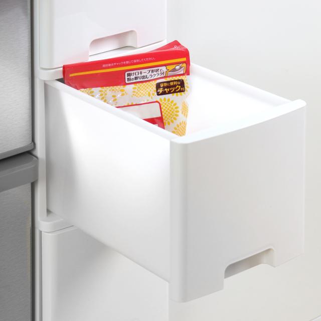 冷蔵庫とシンクの間、食器棚と壁の隙間など、キッチンのちょっとした空きスペースにスッキリ収まるキッチンストッカーです。収納場所に迷うストック食材などもきれいに整理して収納できます。
