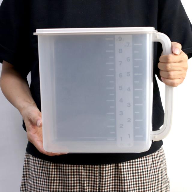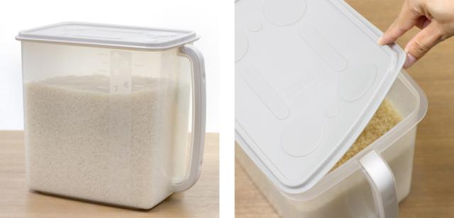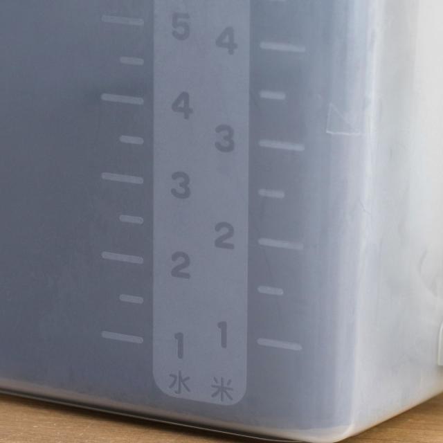 米と水の容量がわかる目盛りが付いています。虫やホコリの侵入を防ぐフタ付きなので、乾物などの保存にもぴったりです。