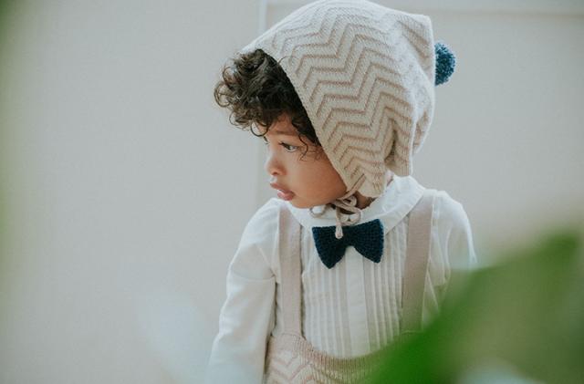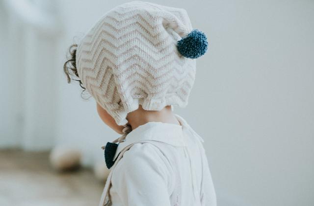 【特徴】ベビーの頭を優しく包み込むコットン素材のボンネ型ニット帽。大きめのぽんぽんで愛らしいシルエットへ。