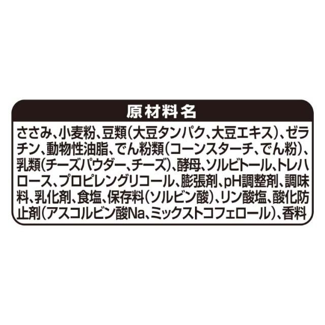 | ささみ、小麦粉、豆類(大豆タンパク、大豆エキス)、ゼラチン、動物性油脂、でん粉類(コーンスターチ、でん粉)、乳類(チーズパウダー、チーズ)、酵母、ソルビトール、トレハロース、プロピレングリコール、膨張剤、pH調整剤、調味料、乳化剤、食塩、保存料(ソルビン酸)、リン酸塩、酸化防止剤(アスコルビン酸Na、ミックストコフェロール)、香料 |