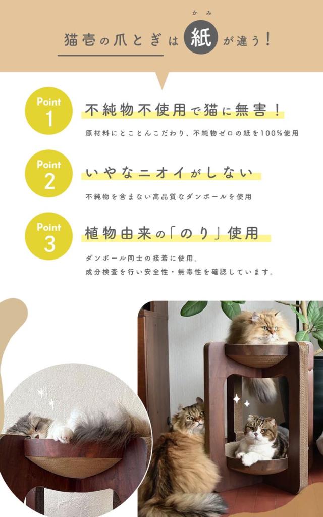 猫壱の人気商品バリバリボウル。やわらかな猫のカラダにぴたりとフィットするすり鉢構造のつめとぎベッド。そんな大人気商品がキャットタワーに。