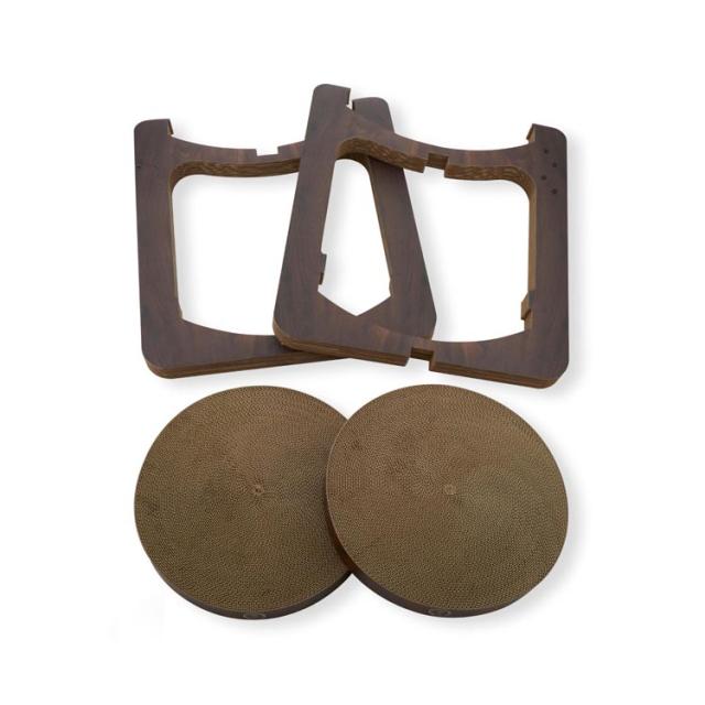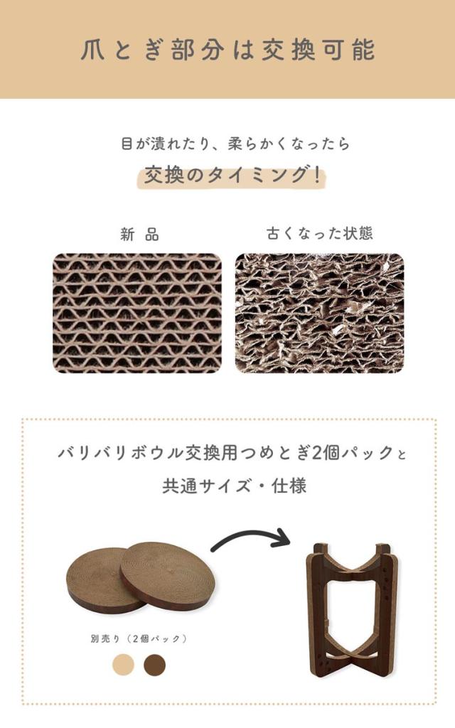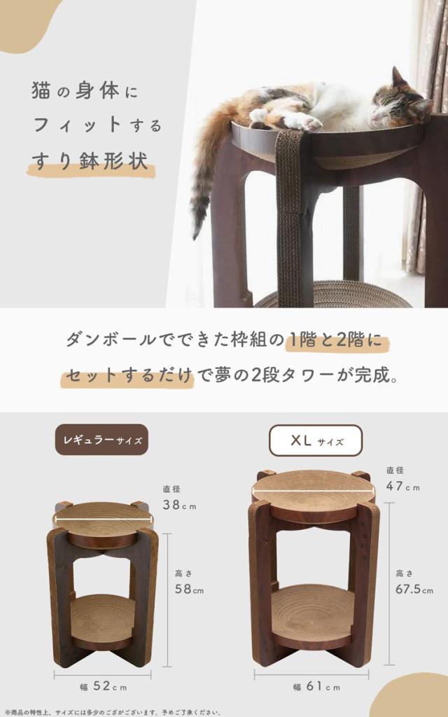 ●バリバリボウルと同じすり鉢構造のつめとぎベッドを、ダンボールでできた枠組の1階と2階にセットするだけで夢のキャットタワーが完成。