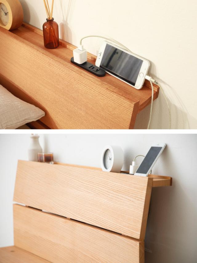 奥行がスリムな宮棚付きです。枕元にスマートフォンやメガネなどのちょっとした小物を置いておくことができます。ホコリが入りにくいスライド式の2口コンセント付きで、寝ている間にスマートフォンやタブレットの充電も可能です。