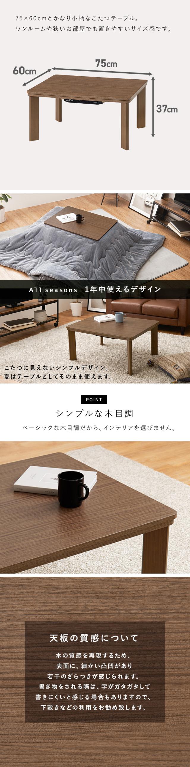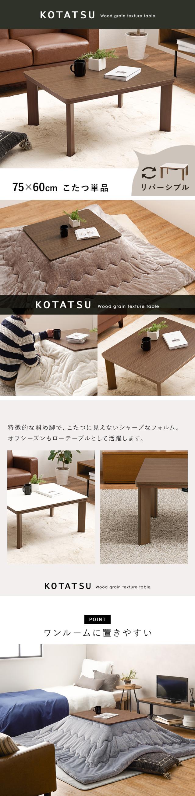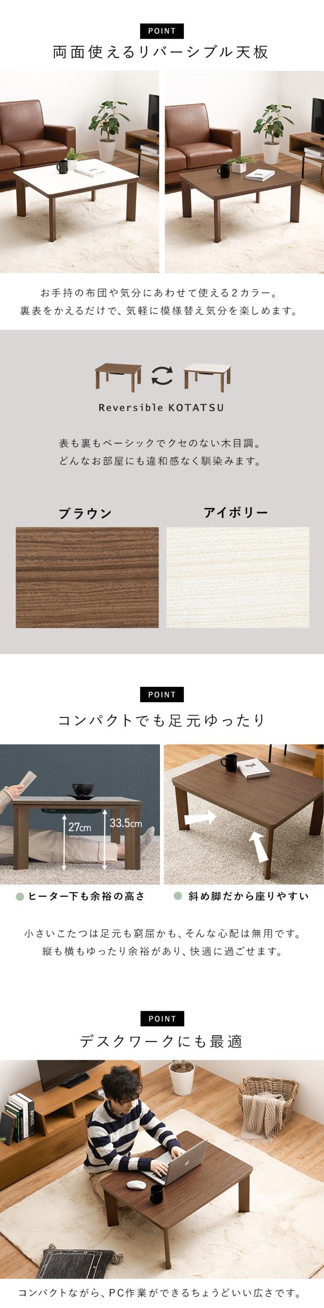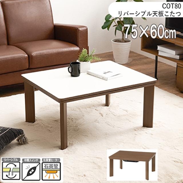 こたつテーブル 幅75×奥行60cm 長方形 リバーシブル天板 ブラウン アイボリー 木目調 斜め脚 木質感 ワンルームこたつ コンパクト COT80