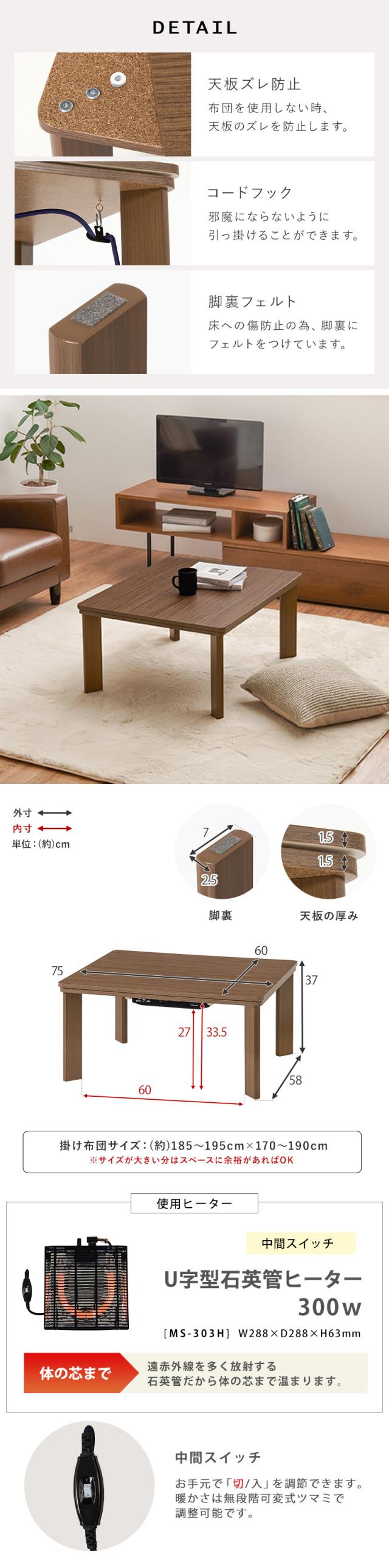「一般的な75cm角の正方形こたつでは少し場所を取る」、「正方形だとオフシーズンにこたつ感が強い」という方にお勧めのサイズ。