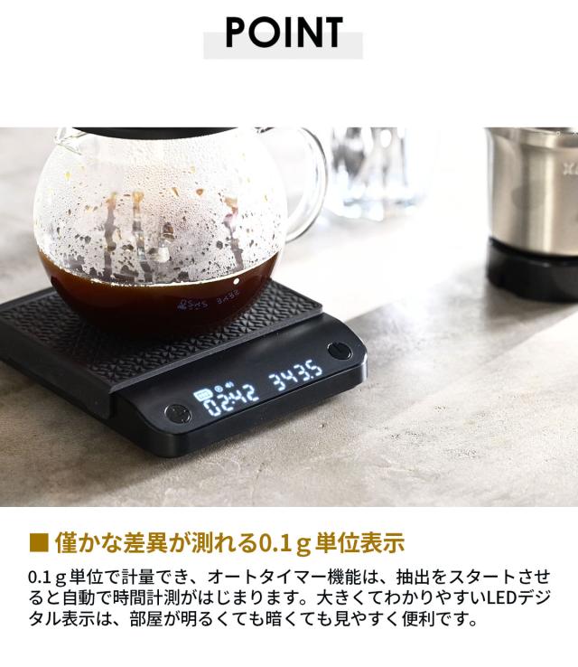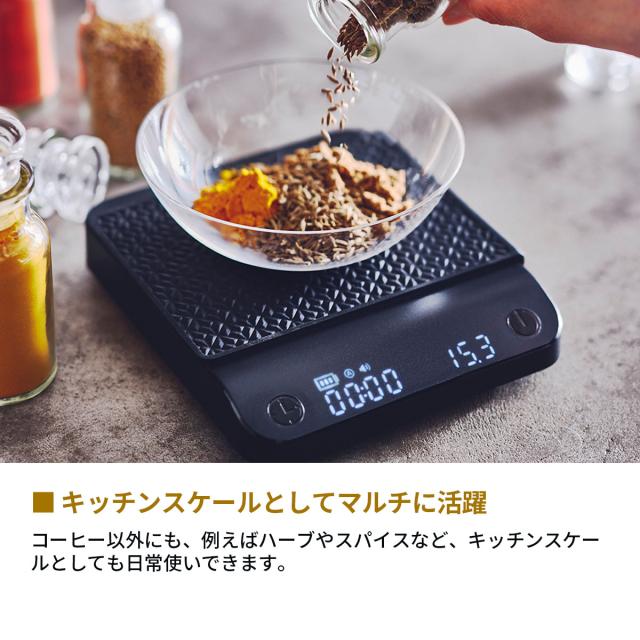 ハンドドリップにこだわる、コーヒーラバーに向けて開発したコーヒースケール。0.1g単位で計量ができ、コーヒー豆の個性と、自分の好みを掛け合わせて、ベストな湯量、スピード、蒸らし時間を模索していくハンドドリップの醍醐味が味わえます。