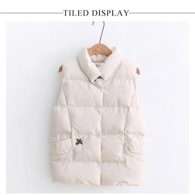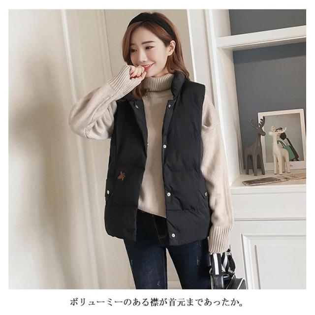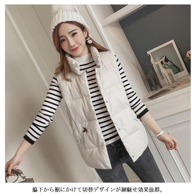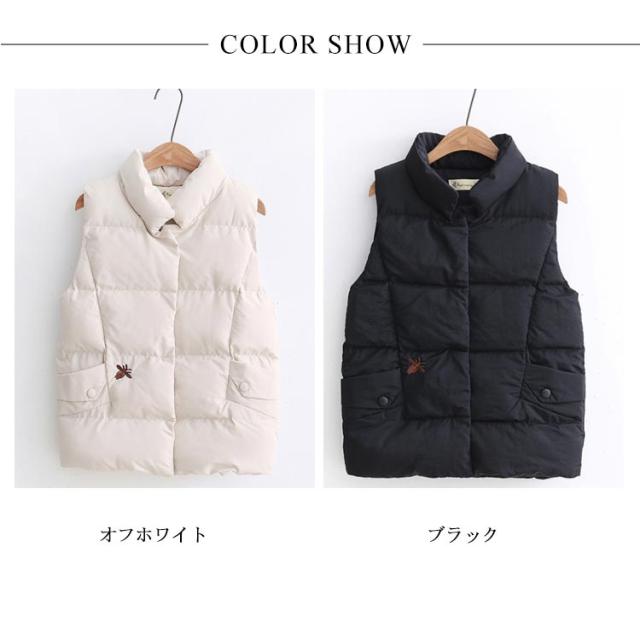 レディース 中綿ベスト ダウンベスト 可愛い 刺繍 ポケット付き アウター ノースリーブ ダウンジャケット 羽織り 防寒 軽量 暖かい ダウン 冬 小顔 おしゃれ エコダウン ベスト スタンドカラー 秋冬