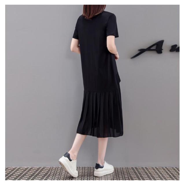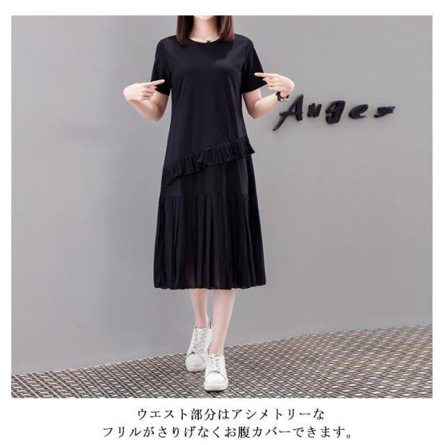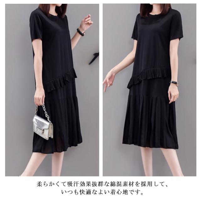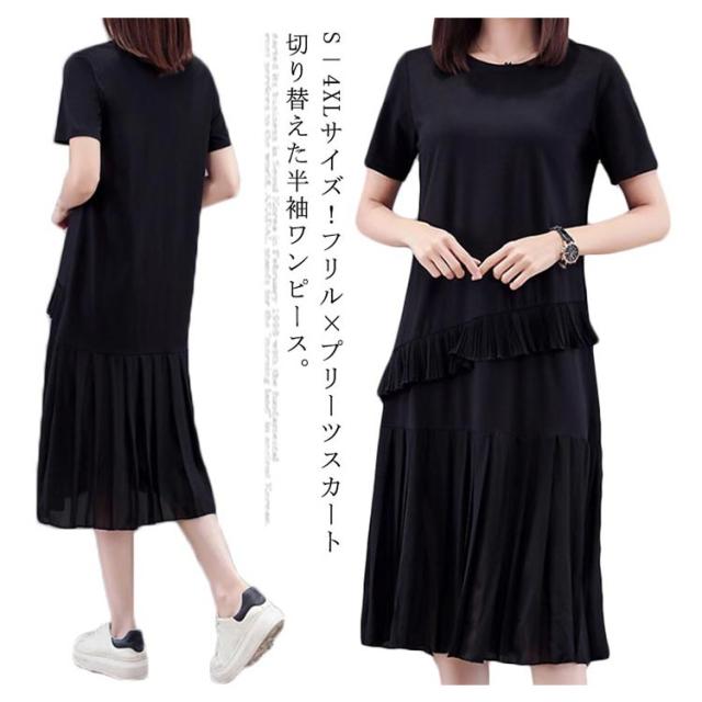 S−4XLサイズ!プリーツスカートワンピース フリル ドッキングワンピース ワンピース 半袖 tシャツワンピース 膝丈 半袖ワンピース 大きサイズ ゆったり 切り替え プリーツ ブラック 夏