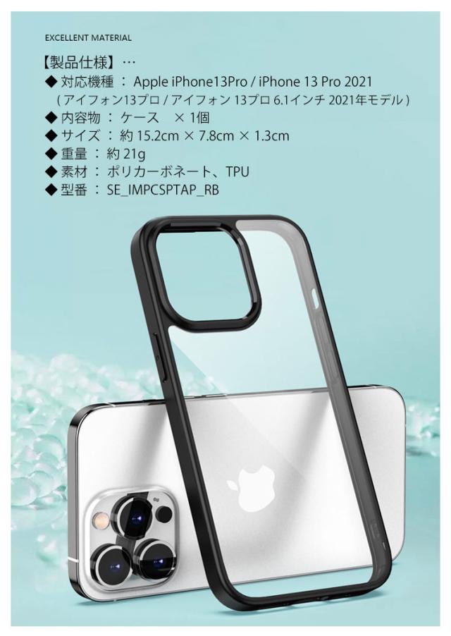 | 【製品仕様】… ◆ 対応機種 : Apple iPhone13Pro / iPhone 13 Pro 2021 ( アイフォン13プロ / アイフォン 13プロ 6.1インチ 2021年モデル ) ◆ 内容物 : ケース × 1個 ◆ サイズ : 約 15.2cm × 7.8cm × 1.3cm ◆ 重量 : 約 21g ◆ 素材 : ポリカーボネート、TPU ◆ 型番 : SE_IMPCSPTAP_RB 【製品特徴】… ◆ 装着時の本体色 : 透けて見える ◆ カード収納 : なし ◆ 衝撃保護性能 : 高 【背面極薄】… 背面素材を0.38mm厚で設計し、ケースをつけたままMagSafe充電器を使用できます。 【ストラップホール付】… ケース下部側面にはストラップホールがあり、お好きなストラップを装着することが可能です。 | |
