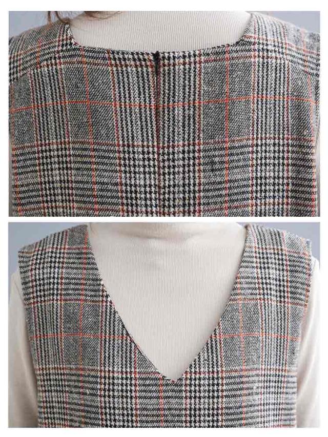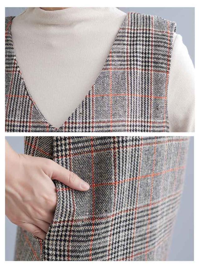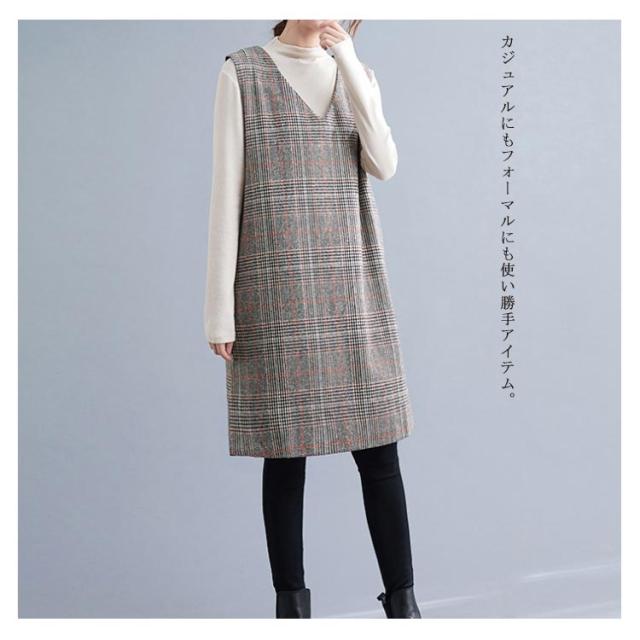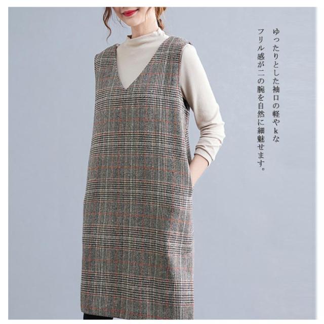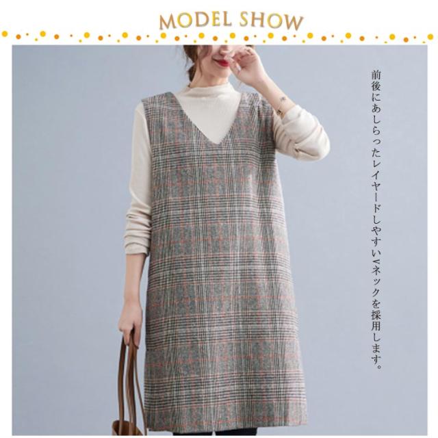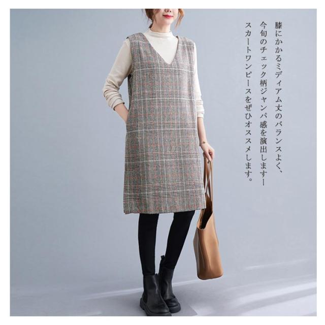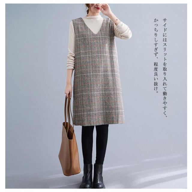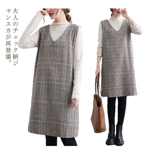 ワンピース グレンチェック 春秋 秋冬 重ね着 ジャンパースカート 膝丈 チュニック ジャンスカ スリット チェック柄 vネック レイヤード 可愛い ゆったり 体型カバー カジュアル フォーマル 20代 30代 40代 50代