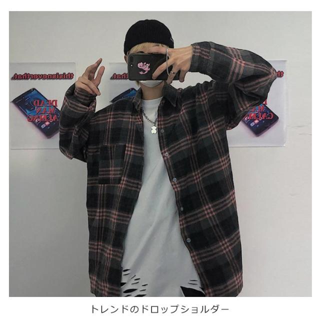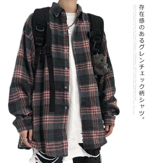 送料無料 シャツ ビッグシルエット グレンチェック柄 オーバーサイズ ゆるシャツ カジュアルシャツ 長袖 トップス メンズ ドロップショルダー おしゃれ 男女兼用 学生 通勤 お出かけ 春服 秋物 春秋