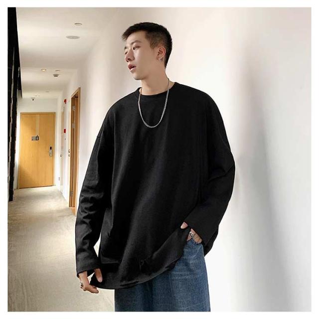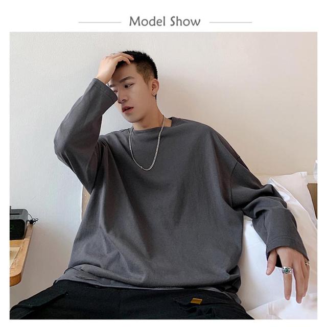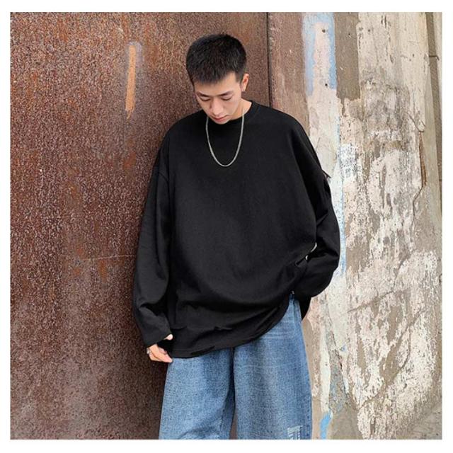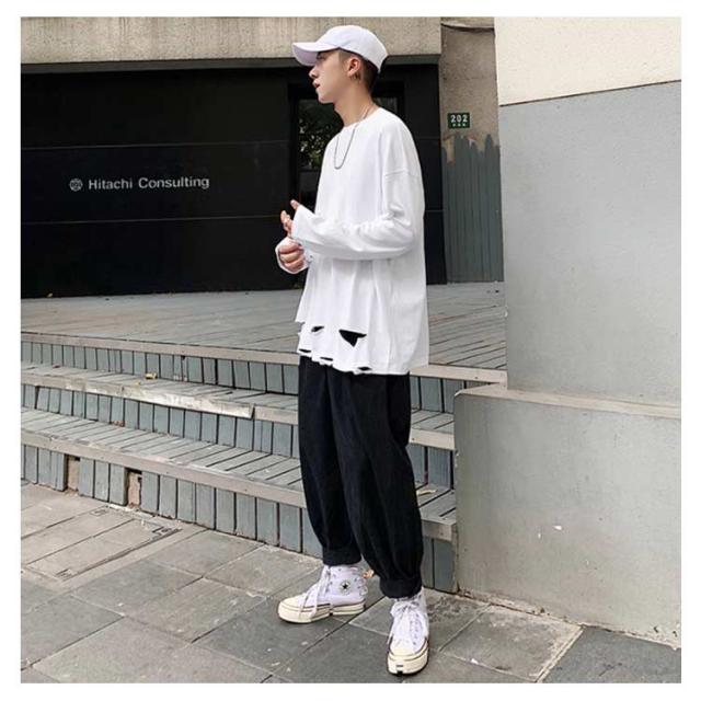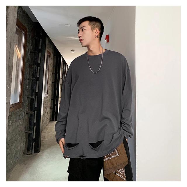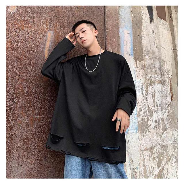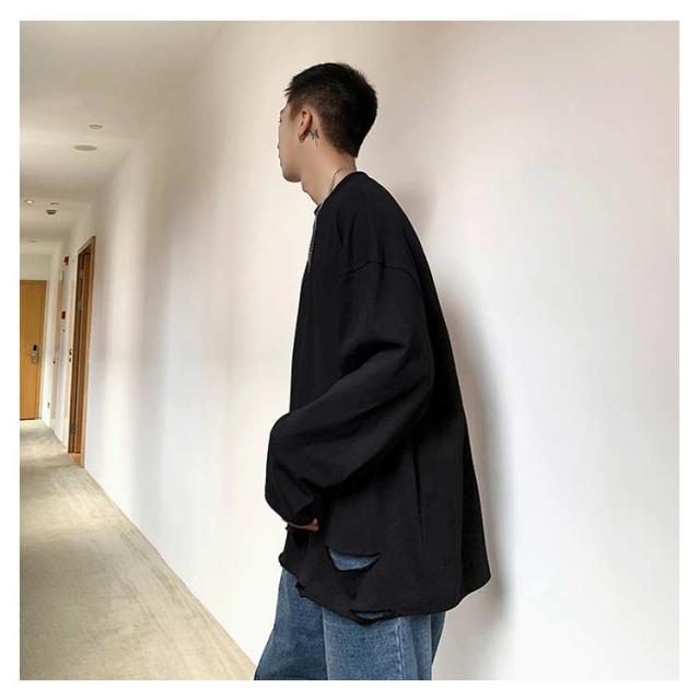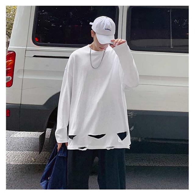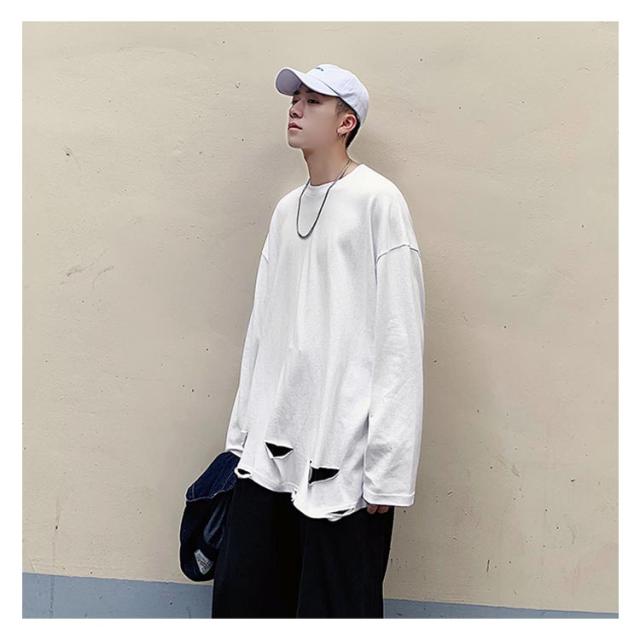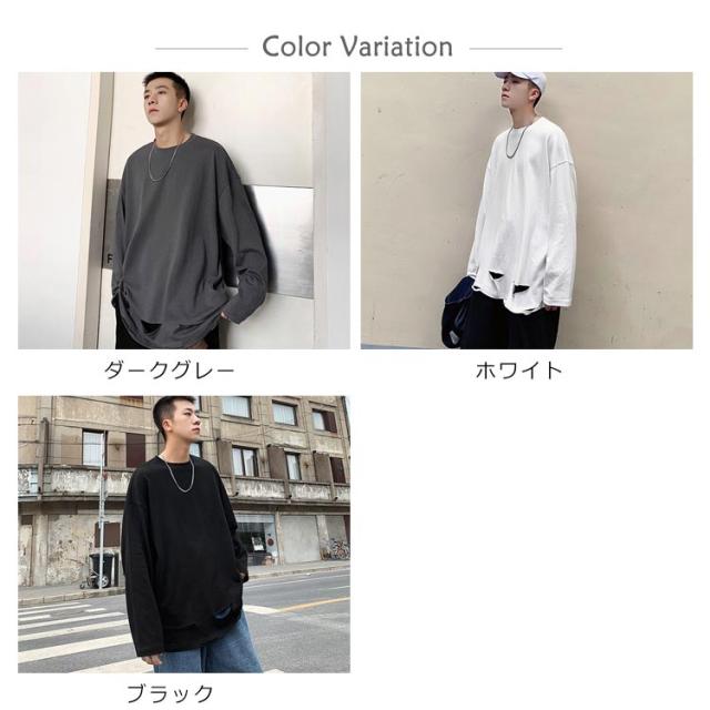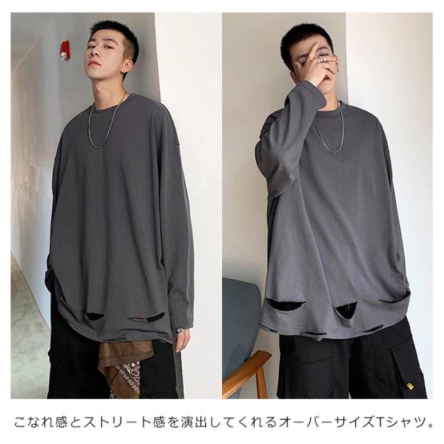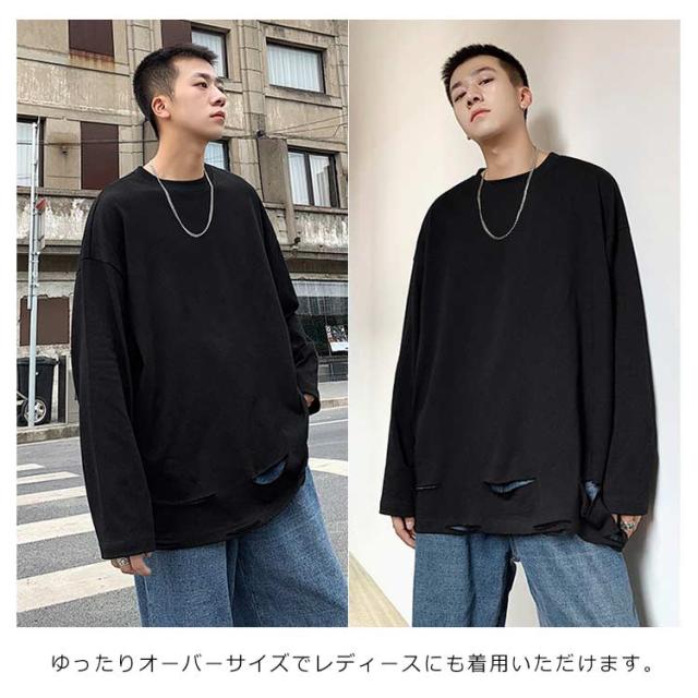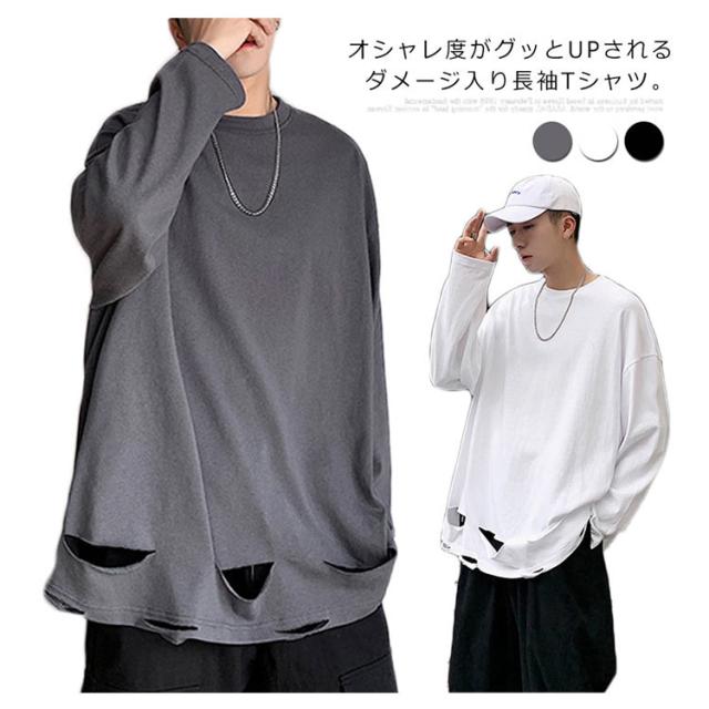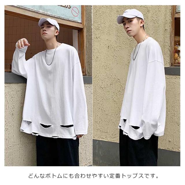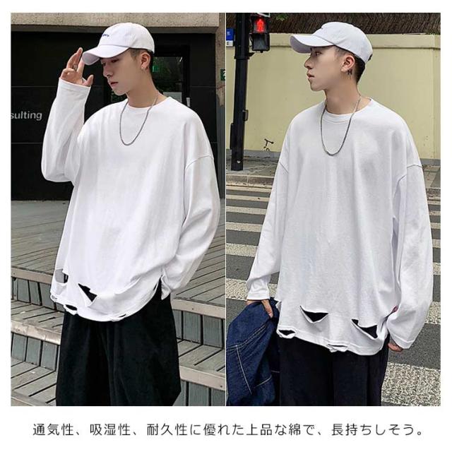 送料無料 個性的 ダメージ加工 tシャツ やぶれ 長袖Tシャツ 無地 ゆったり メンズ ロンT 長袖 トップス カットソー オーバーサイズ Tシャツ ラウンドネック ビッグ ドロップショルダー ストリート系 モード 春夏 秋服