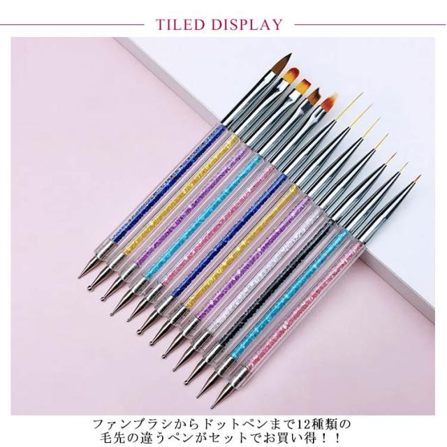 | ネイルアートブラシの12本セットです。 ファンブラシからドットペンまで12種類の毛先の違うペンがセットでお買い得!! この1セットで幅広いネイルアートが楽しめます♪ | |