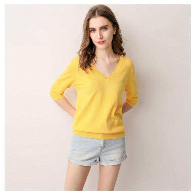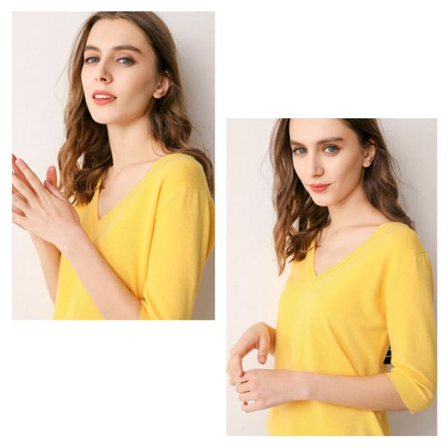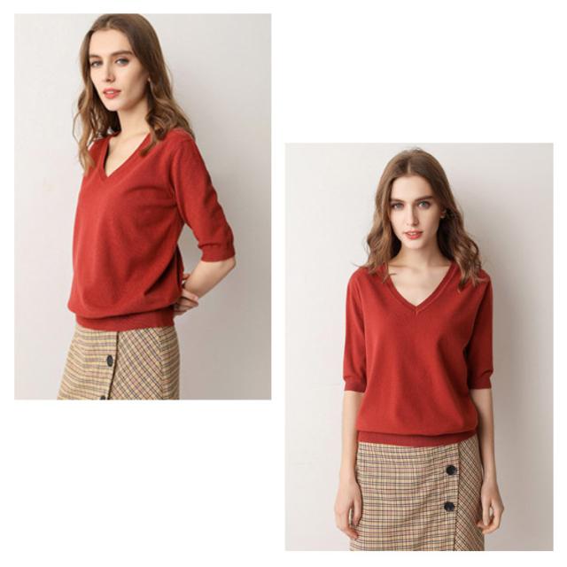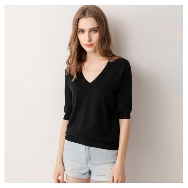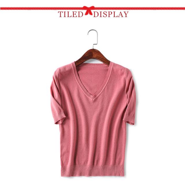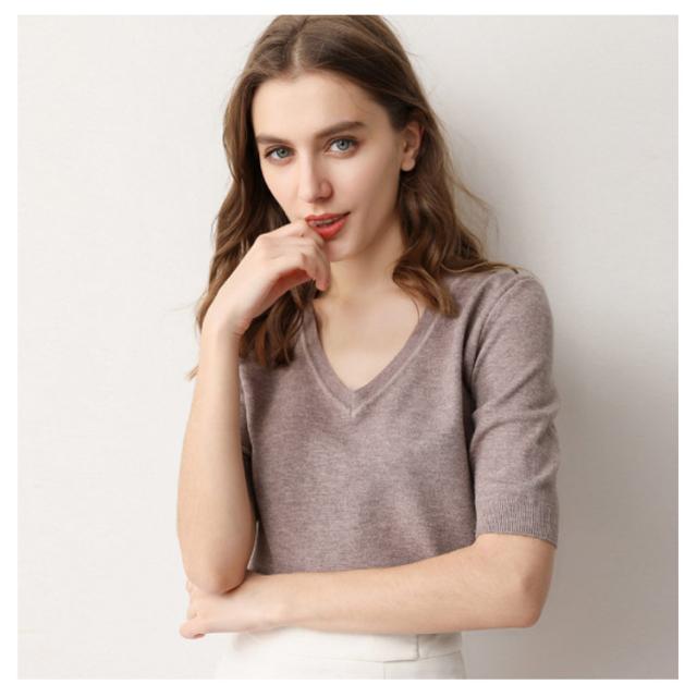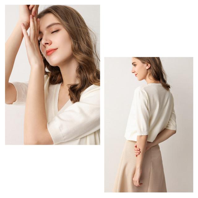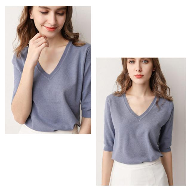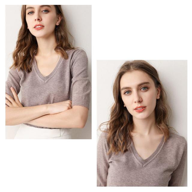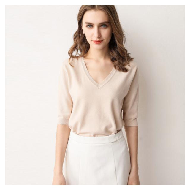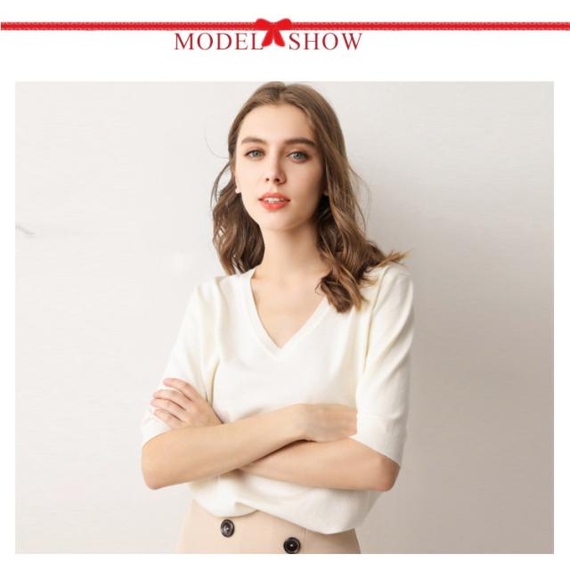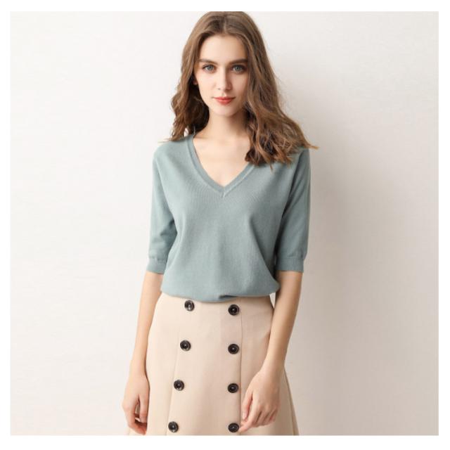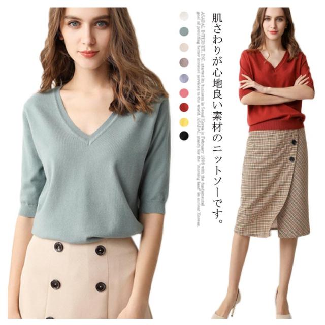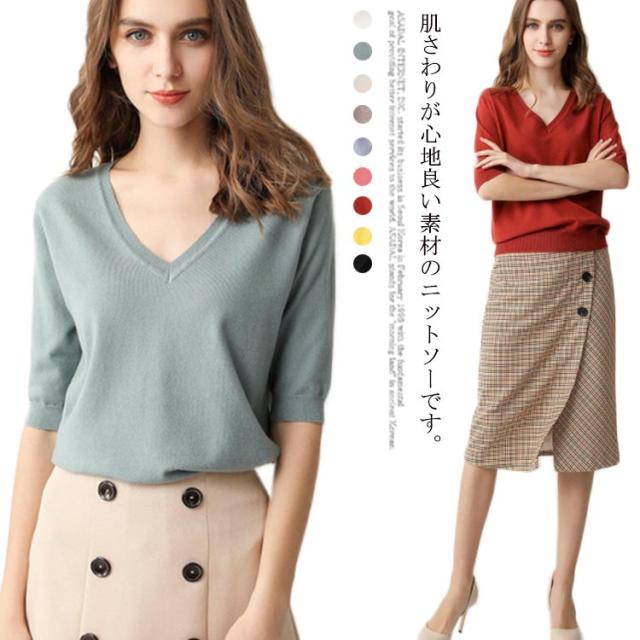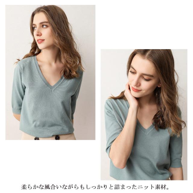 サマーニット Vネック ニット トップス レディース 五分袖 半袖 プルオーバー ドロップショルダー 薄手 ニットセーター シンプル 無地 きれいめ カジュアル