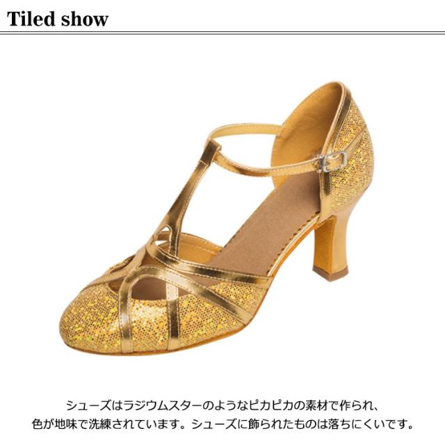 | シューズはラジウムスターのようなピカピカの素材で作られ、色が地味で洗練されています。シューズに飾られたものは落ちにくいです。 軽量性、通気性、快適性に優れたデザインを採用したダンスシューズです、自由自在に踊れますよ。 靴先は丸い靴型を採用して、足の形状にぴったりフィットしているので、足の動きをスムースにします。 ダンスシューズは専門外やプロの舞踏会、ダンスパーティー、パーティー、結婚式、練習、パフォーマンスなどに適しています。 | |