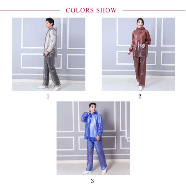 | 防水素材PVCフィルムで作られており、水を吸収したり、水が浸入することもなく、雨や雪の侵入を防ぐ二重袖など、機能性も大変充実しています。 通学、通勤にはもちろん、汚れが気になる倉庫での作業や、工業、農作業、釣りなどの場面で、大活躍してくれる人気アイテムです。 ボタンは落電を防止するプラスチックボタンを使用しており、裏面にはベトつきにくい凹凸加工になっています。 また、小さく折りたため軽いので携帯に便利です。 シックでカジュアルな無地デザインなので、メンズ・レディース関係なく着用できます。 男性はかっこいい着こなしに、女性はかわいい着こなしが楽しめます。 雨の日でも、オシャレに楽しめるレインウェア、ひとつ持っておくことで、あらゆる場面で活躍してくれるので、おすすめです。 汚れが付きにくい撥水加工が施されているので、畑作業・ガーデニングなどにも使用できます。 さらに、薄手で着やすく、動きやすい、魅力的な一点です。 また、折り畳んで持ち運ぶこともでき、収納スペースをとらない軽量でコンパクトな大きさが、大変便利です。 もちろん、上、下、バラバラで着用してもOKです。 ズボンだけ着用すれば、泥や水の撥ねから足元を守れて、利便性抜群です。 急な雨でも、サッと被って防雨。脱ぎ着もとっても簡単で楽ちんです。 | |