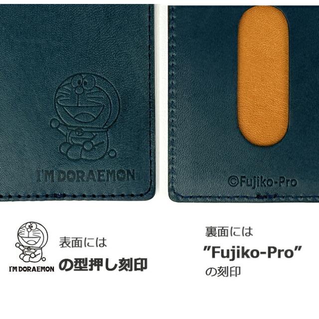 「I’M DORAEMON」のロゴとドラえもんが型押しされたおしゃれなパスケース。