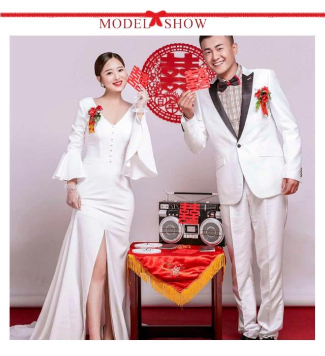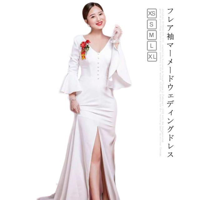 ウエディングドレス 二次会 Vネック マーメードドレス スレンダーライン フォトウェディング ドレス フォトウェディング リゾートウェディング セパレートドレス トレーン付き ドレス 長袖 プリーツ袖