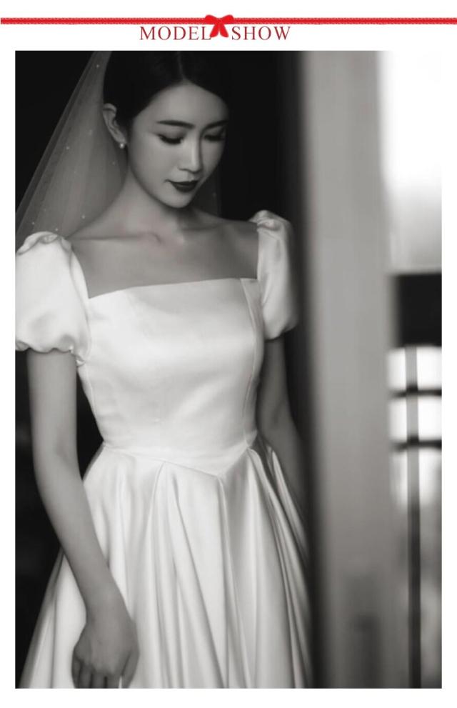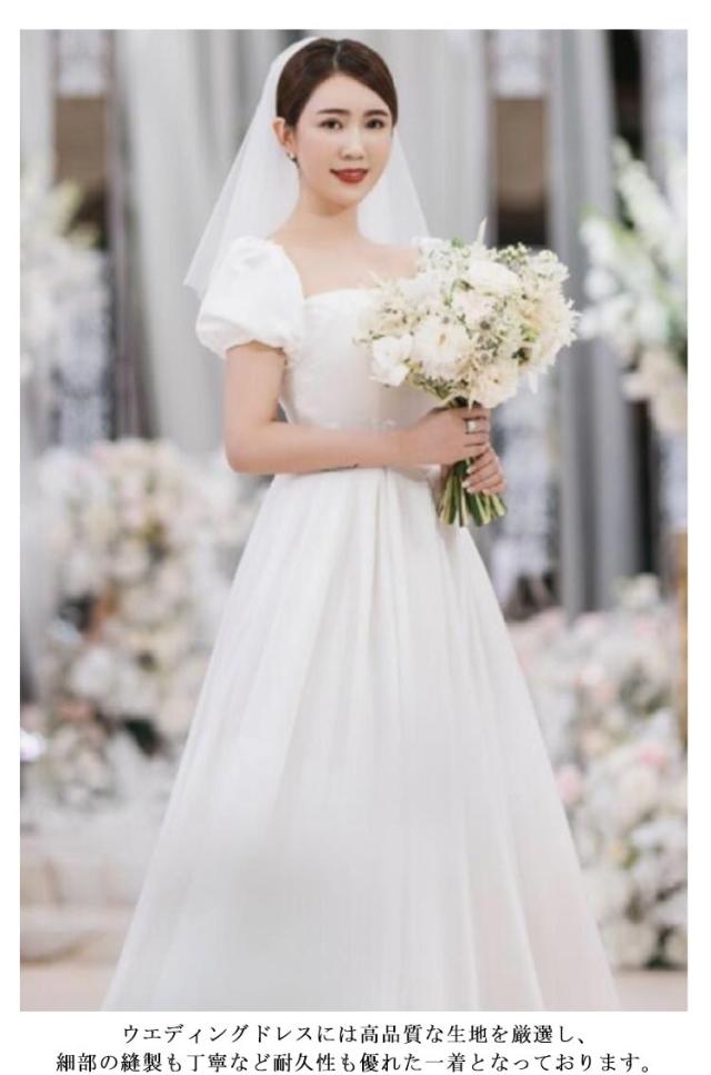 ウエディングドレス ウェディングドレス 袖あり 半袖 パフスリーブ トレーン付き ドレス スクエアネック エンパイアライン エンパイアドレス 花嫁ドレス 白 ホワイト ブライダル 撮影 海外挙式