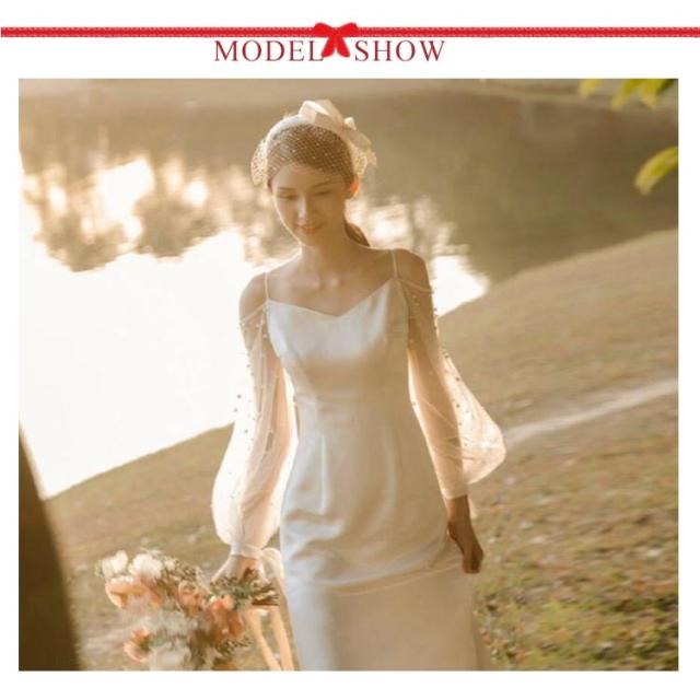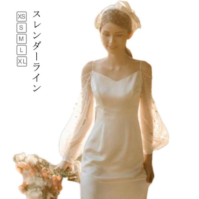 ウエディングドレス ウェディングドレス 袖あり 長袖 パフスリーブ スレンダーライン ドレス Vネック チューブトップ ドレス 花嫁ドレス 白 ホワイト ブライダル 撮影 海外挙式