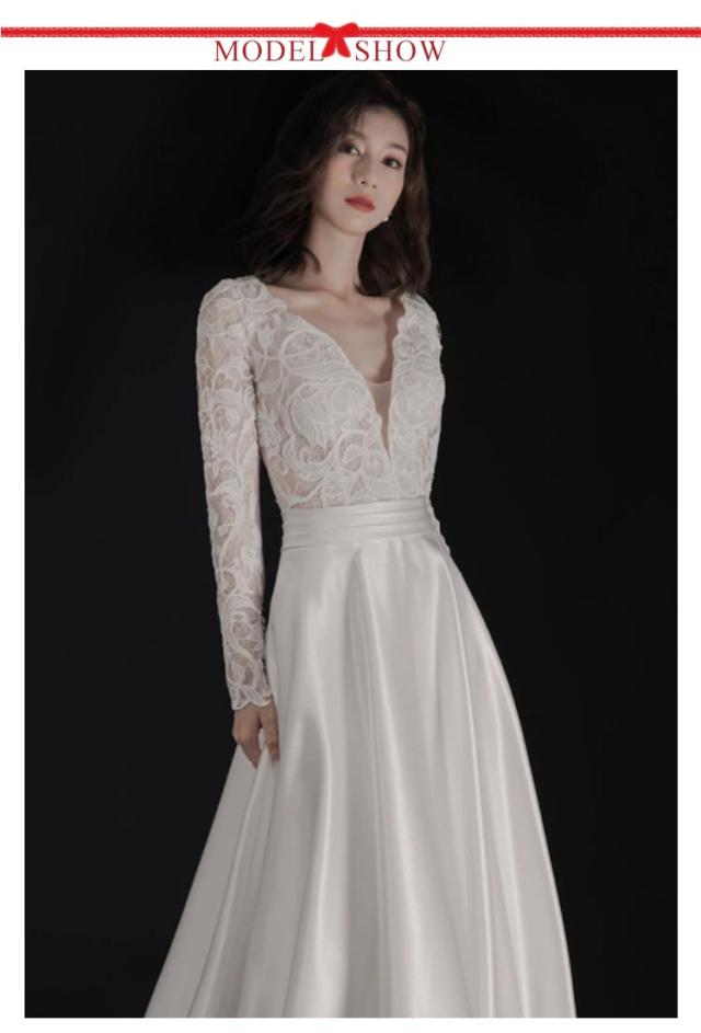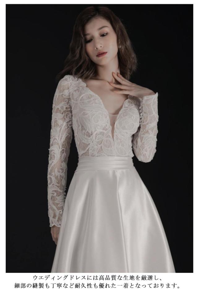 ウエディングドレス ウェディングドレス 袖あり 長袖 レース ドレス Aライン Vネック トレーン付き ドレス ロング 花嫁ドレス 白 ホワイト ブライダル 撮影 海外挙式