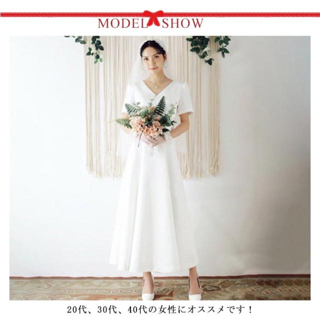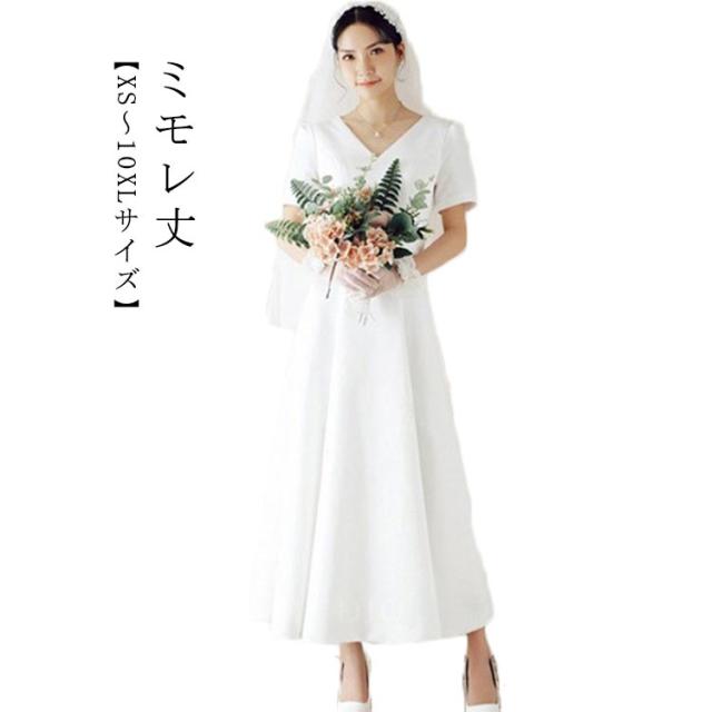 ウェディングドレス ミモレ丈【XS〜10XLサイズ】大きいサイズ ウエディングドレス ワンピース Aライン 半袖 ミモレ Vネック ドレス パーティードレス パーティドレス ファスナータイプ 披露宴 結婚式 演奏会 発表会 海外挙式ドレス