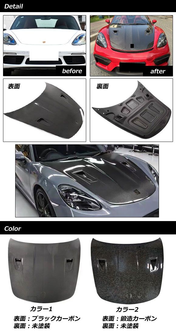 ボンネット ポルシェ 718ボクスター 982 2016年02月〜 カラー2 カーボンファイバー+FRP製 AP-XT2362-COL2