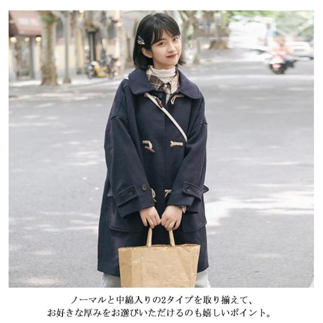 | 通勤通学に最適!多くの方に愛される定番ダッフルコート。 ヒップもすっぽりカバーするロング丈で体型もカバーしてくれる女性に嬉しい1着。 あると便利なサイドポケットで実用的。 ストンとした落ち感とゆとりを持たせたIラインシルエット。 シンプルなデザインで合わせるボトムスを選ばず、カジュアルからガーリーまで幅広いコーデに活躍。 ノーマルと中綿入りの2タイプを取り揃えて、お好きな厚みをお選びいただけるのも嬉しいポイント。 ゆったりしたサイズ感で、厚手のニットやジャケット、スウェットなどを重ね着したり、着込んだりしてもOK! | |