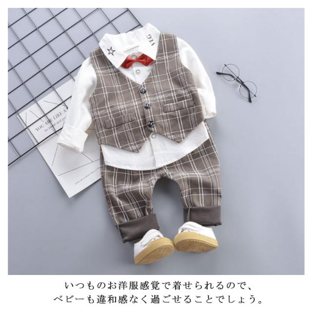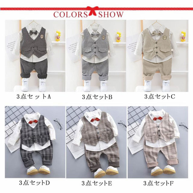 | ベスト/シャツ/ズボンがセットになったお買い得な男児フォーマルスーツ3点セット。 きっと可愛い姿に、会場の注目の的になること間違いなしですね。 ズボンのウエストはゴム仕様となっています。 結婚式や発表会、七五三などではフルセットでキメて、ベストなしの着こなしならちょっとしたお出かけやパーティー、お食事会などにも最適 きちんとスタイルの印象なのに、セパレートタイプだから着脱も簡単! いつものお洋服感覚で着せられるので、ベビーも違和感なく過ごせることでしょう。 後ろから見てもカッコいい、 ボーイズフォーマルスタイルに変身できちゃいます。 結婚式やパーティーなど、フォーマルシーンで大活躍間違いなし! | |