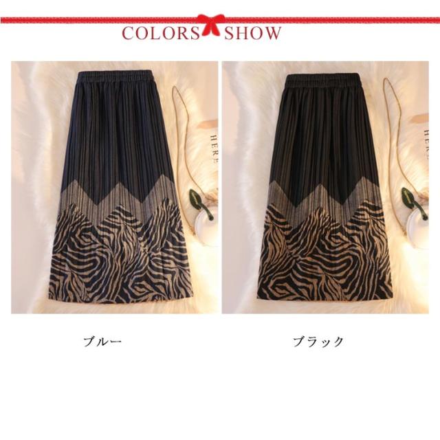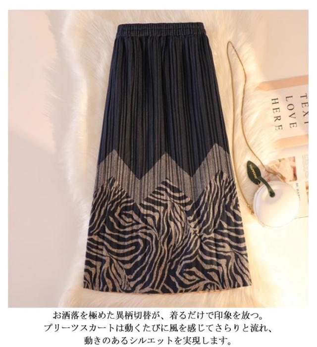 プリーツスカート ロング プリーツ スカート ロングスカート 異素材 配色 切替 こだわり ロングスカート 冬スカート 秋スカート ヒョウ柄 スカート ブラック ブルー きれいめ きれい目