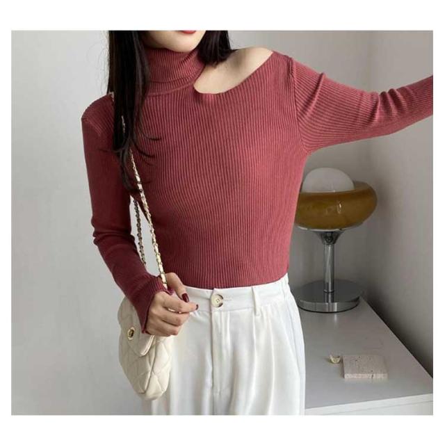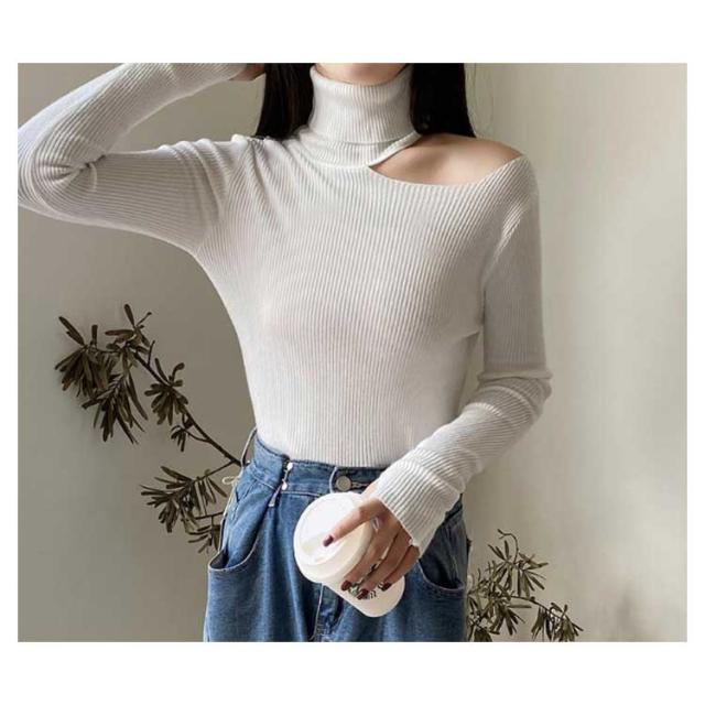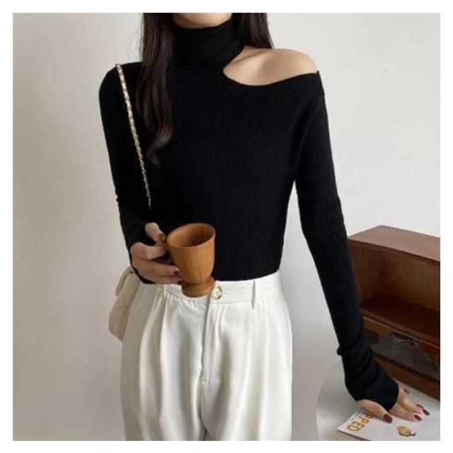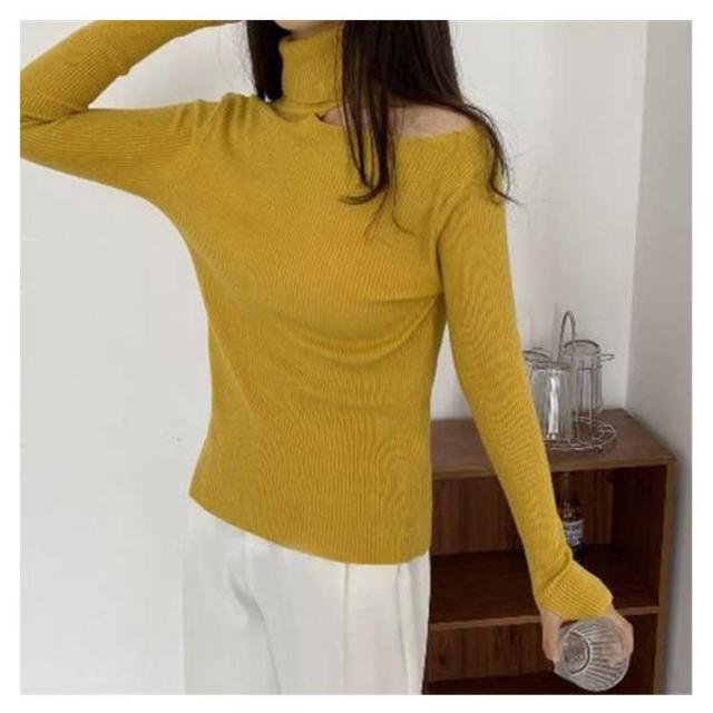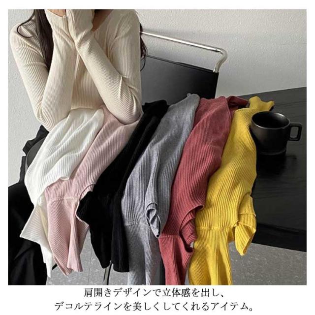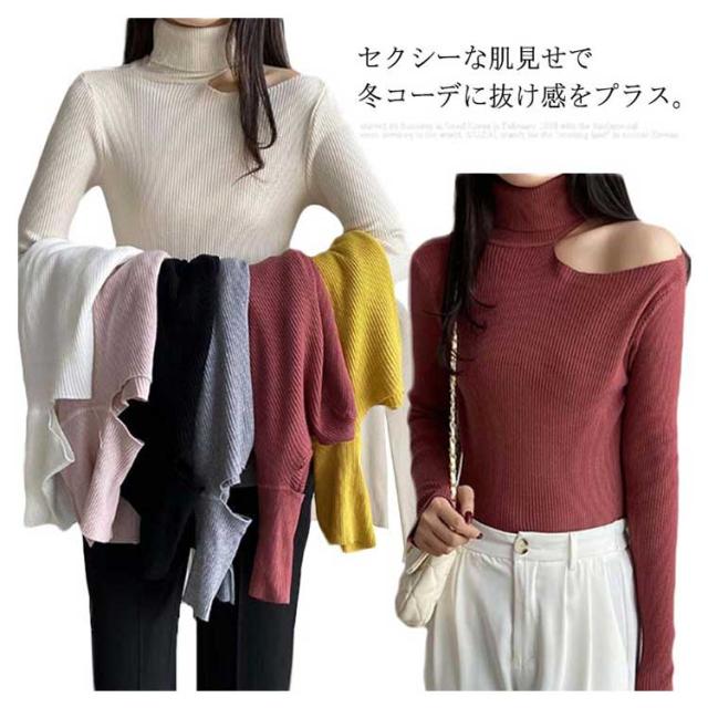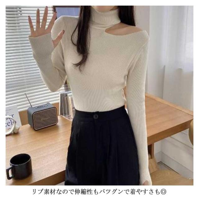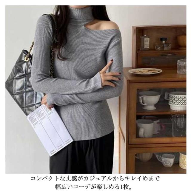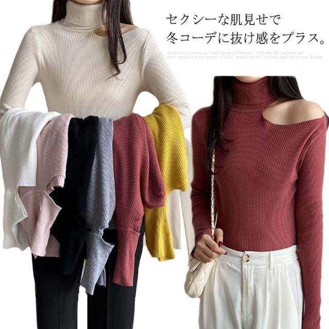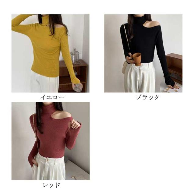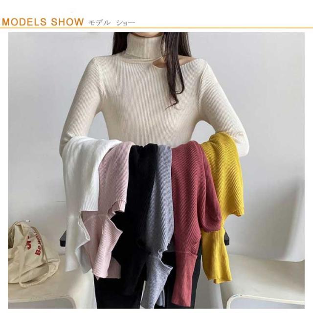 カットソー ハイネック リブニット レディース ニットセーター トップス 長袖 タートルネック インナー 肩開き 肩出し リブ 細身 タイト スリム セクシー チクチクしない やわらか 伸縮性 秋冬 秋 冬 無地