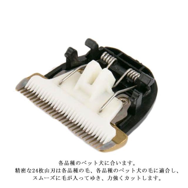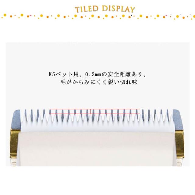 | 厚みのあるチタンセラミック刃が登場。 K5ペット用、0.2mmの安全距離あり、毛がからみにくく鋭い切れ味 刃の先端はカーブ加工を施しており、どの角度で皮膚に当たっても安全な設計になっています。 R型鈍角制髪の方が肌に触れても傷つきません。 各品種のペット犬に合います。精密な24枚山刃は各品種の毛、各品種のペット犬の毛に適合し、スムーズに毛が入ってゆき、力強くカットします。 | |