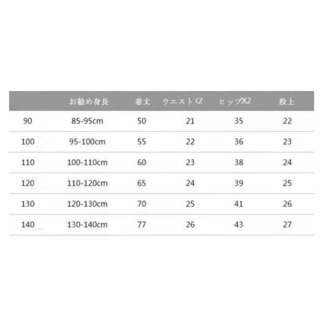 | サイズについての説明 | 身長 90:80-90cm 100:90-100cm 110:100-11-cm 120:110-120cm 130:120-130cm 140:130-140cm |