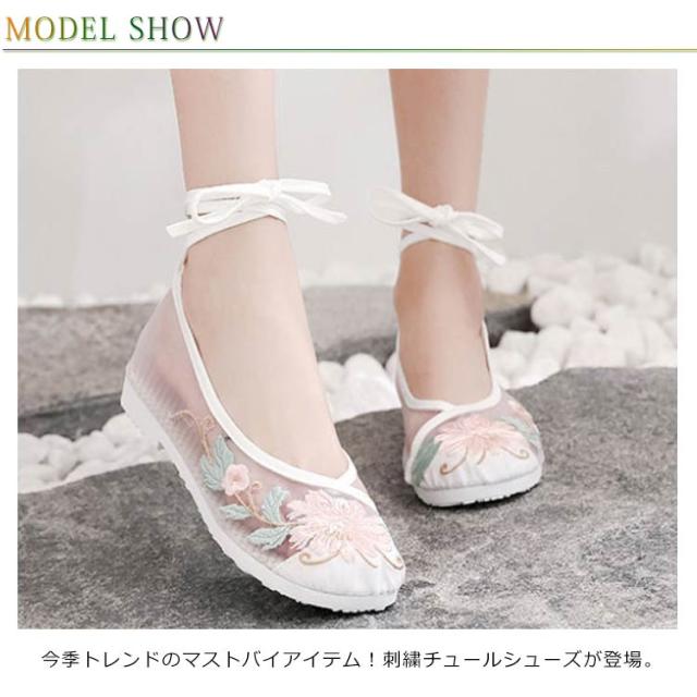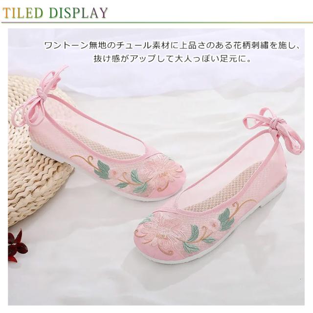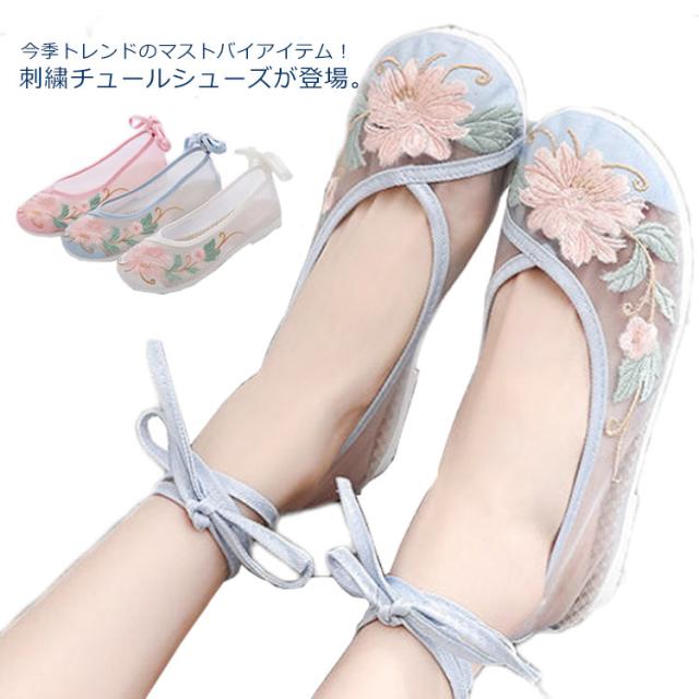 チャイナシューズ 刺繍パンプス ローヒール ぺたんこ 刺繍チュールシューズ やわらかい 痛くない トレンド 人気 刺繍 レディース フラットシューズ 靴 花柄 刺繍 シアー チュール メッシュ 透け パステル 楽ちん 婦人靴 通勤
