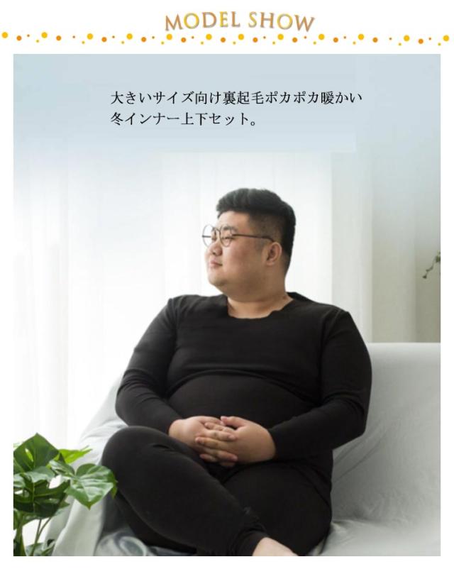 | 大きいサイズ向け裏起毛ポカポカ暖かい冬インナー上下セット。 保温性に優れたの裏起毛が優しく肌を包み込み寒さ対策に大活躍! 表面は伸縮性の高いストレッチ素材で締め付けを感じさせず快適な着心地。 寒い日のインナーはもちろん、お部屋でリラックスタイムにも 1枚で着ても重ね着でも使える。シンプルで冬の着回しに活躍。 | |