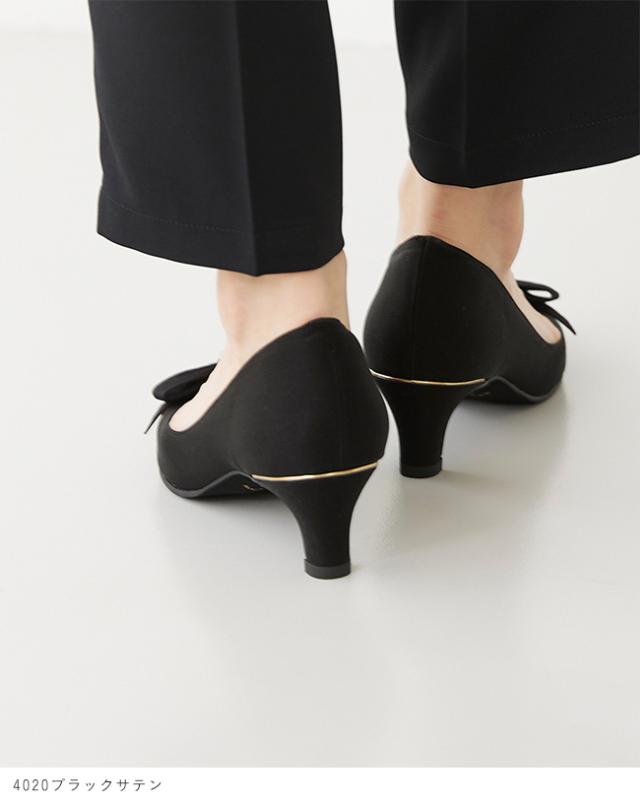 上品な質感のサテン生地で施されたリボンモチーフが甘すぎない大人な可愛さを持ったパンプス。