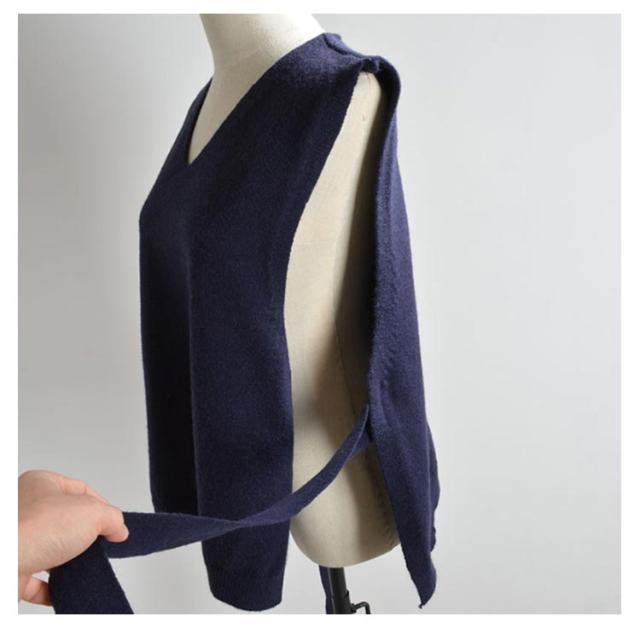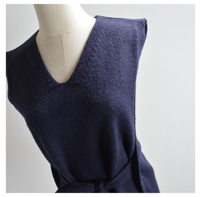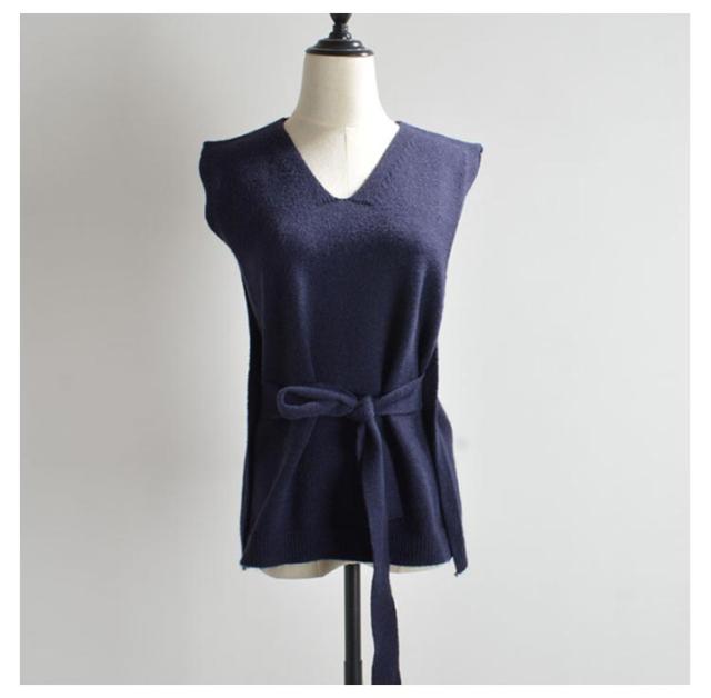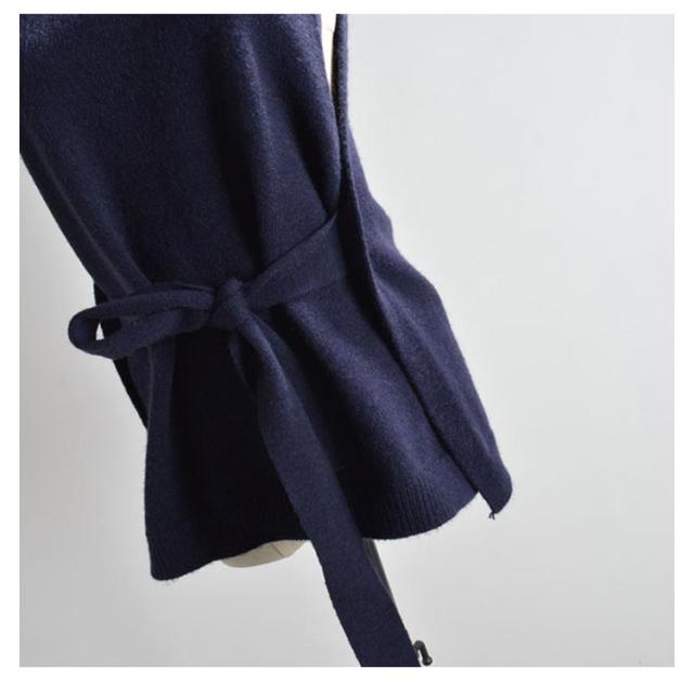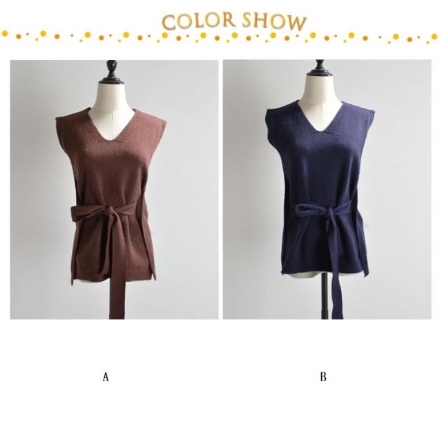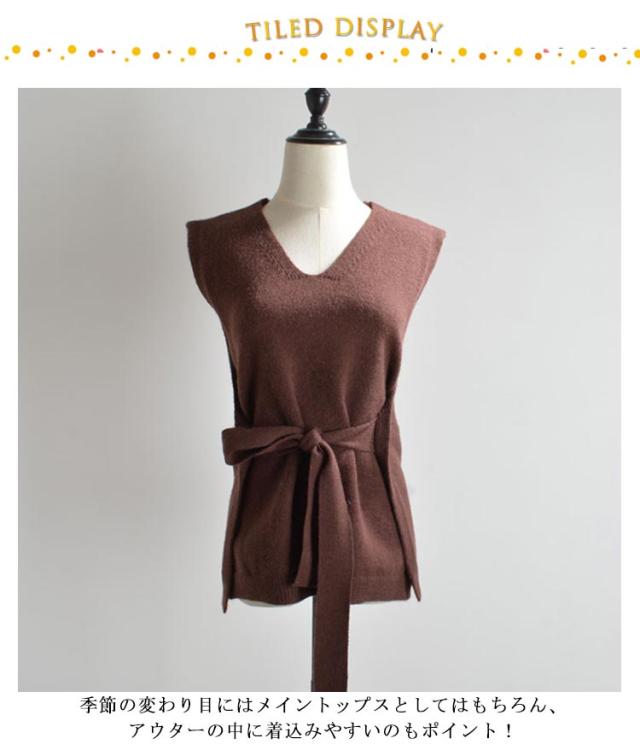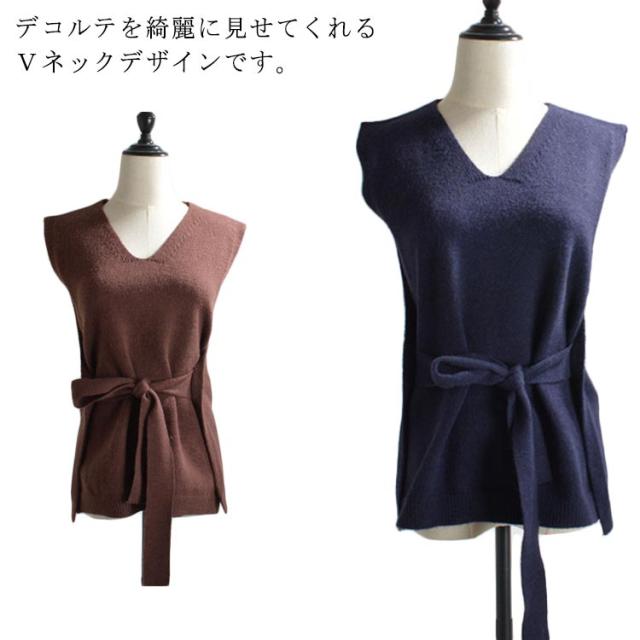 ニットベスト レディース Vネック ノースリーブ 送料無料 重ね着 秋 春 冬 レイヤードセーター ウエストリボン ベスト ロング ロング丈 無地 ゆったり 体型カバー 着痩せ おしゃれ 秋物 春物 上品 フェミニン