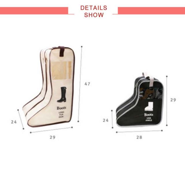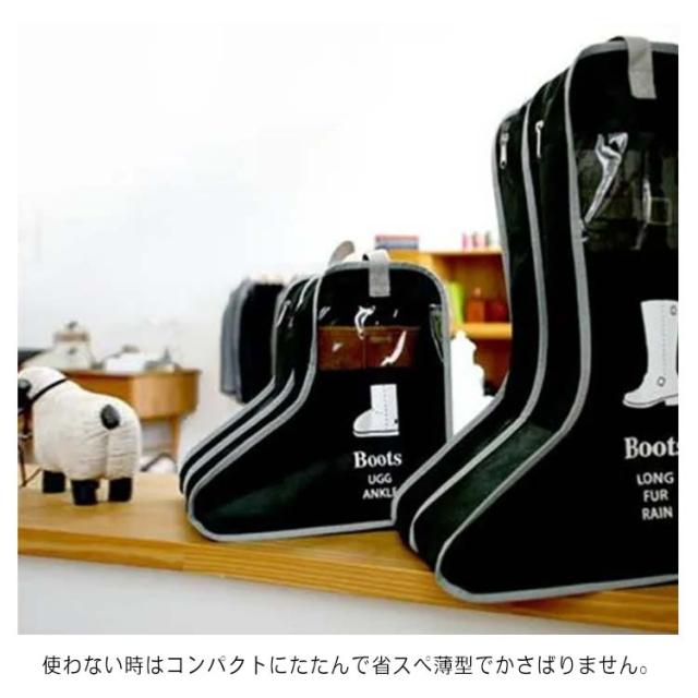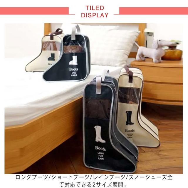 | シンプルで使いやすく、大切な靴の収納に重宝するブーツ収納袋。 ロングブーツ/ショートブーツ/レインブーツ/スノーシューズ全て対応できる2サイズ展開。 通気性のよい素材を使用、ホコリをよけキズから守ってくれます。 出す時もファスナーでさっと開閉、収納用だけでなく、旅行の荷物整理やラッピングなどにも使えます。 使わない時はコンパクトにたたんで省スペ薄型でかさばりません。 持ち運びに便利な取っ手が付いており、携帯しやすく、いざという時に重宝します。 透明窓は収納したブーツが一目で分かります!さらに便利な仕様にバージョンアップ! | |