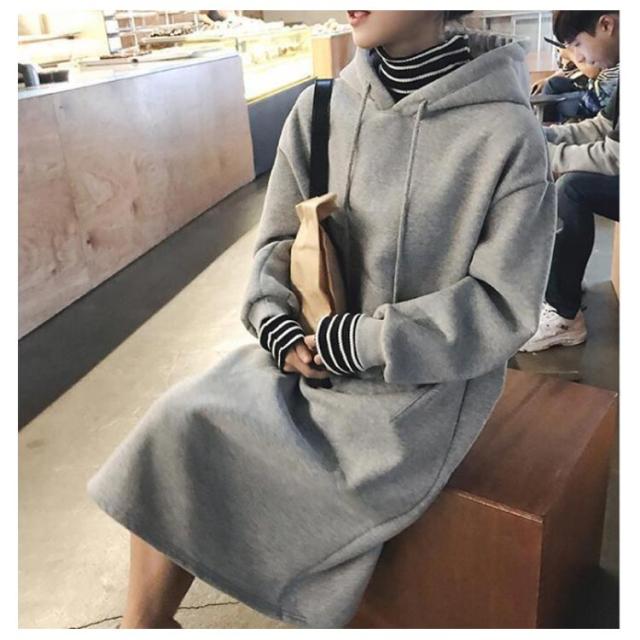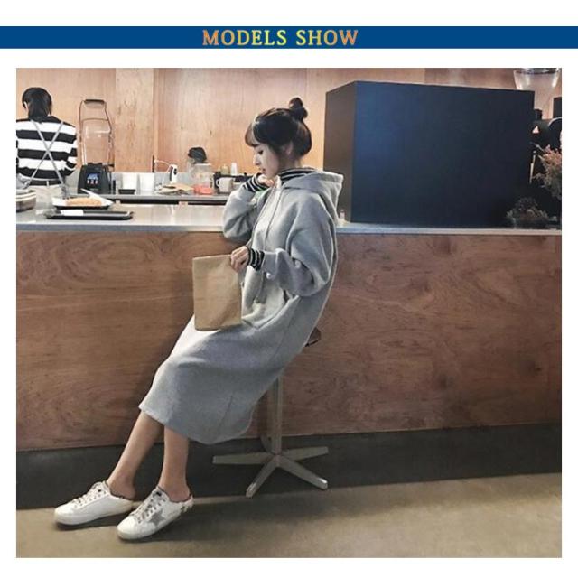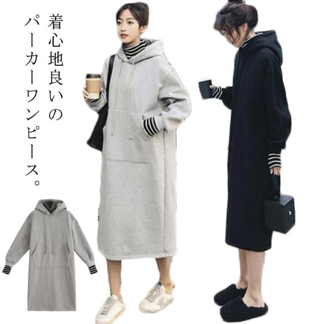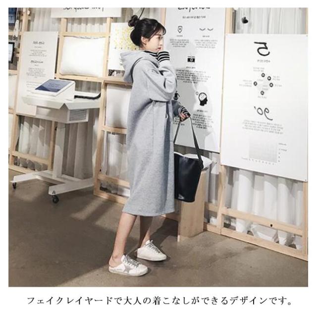 フェイクレイヤード パーカーワンピース ワンピース ボーダー 切り替え ロングパーカー 大きいサイズ ゆったり モックネック ロングワンピース フード付き 秋冬 あったか 裏起毛 ポケット おしゃれ 通勤 通学 M L XL 2XL 3XL 4XL
