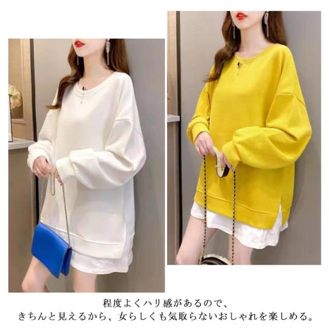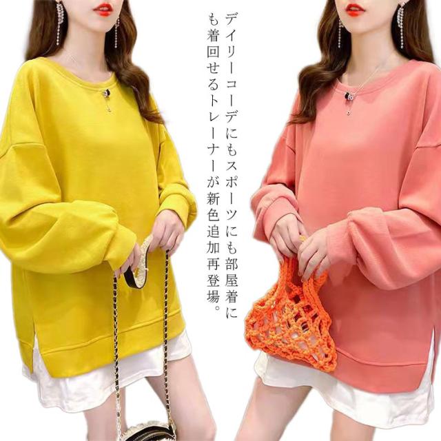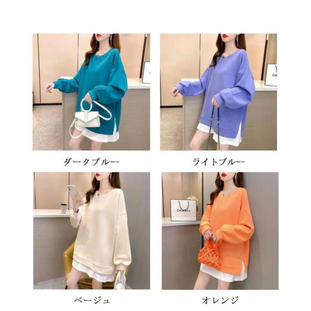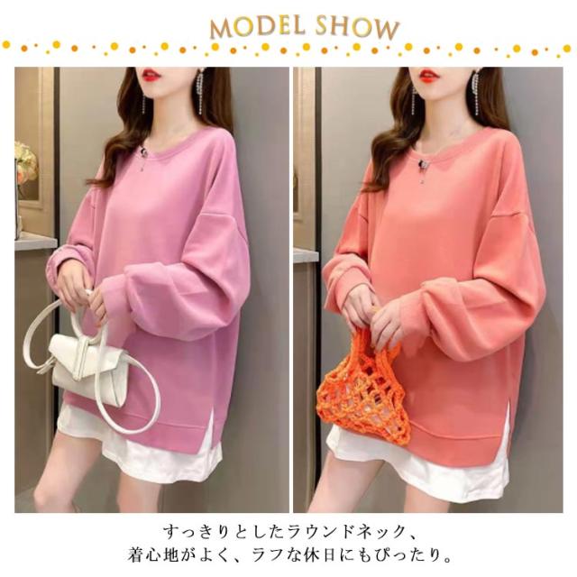 全11色!重ね着風トレーナー ドロップスリーブ トレーナー トップス レディース 重ね着風 スウエット プルオーバー ラウンドネック レイヤード ドルマンシルエット 大きサイズ ゆったり 裾切替 スリット 春 秋 おしゃれ カジュアル コットン送料無料