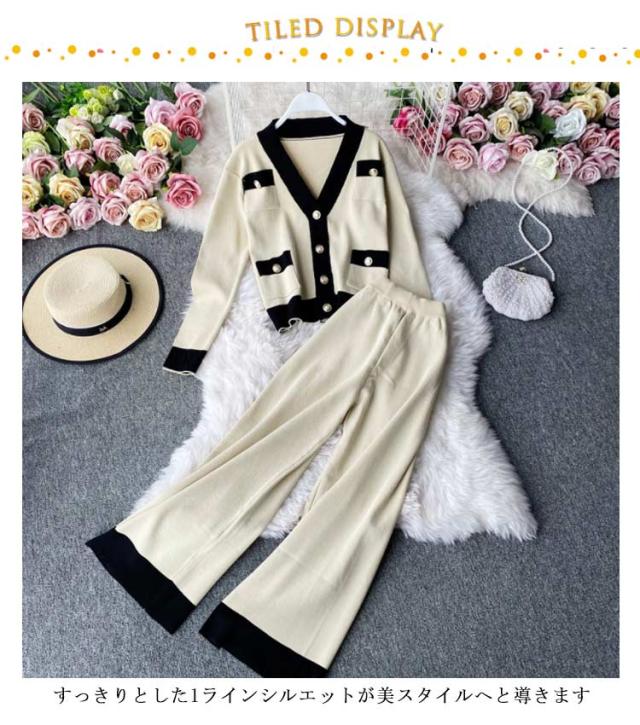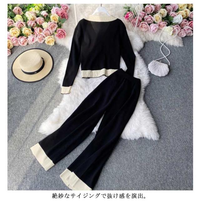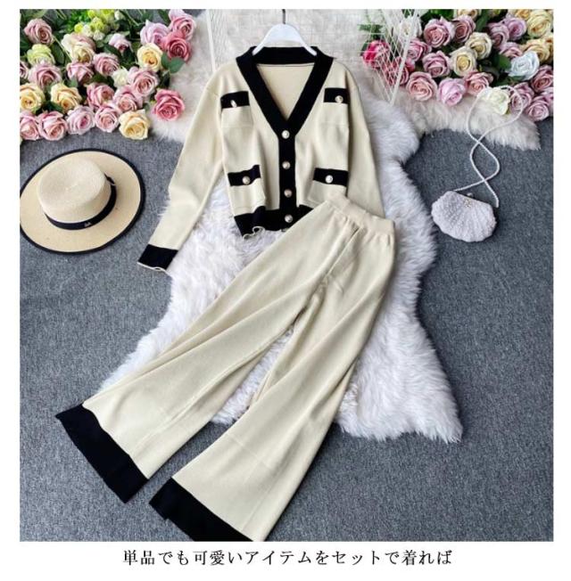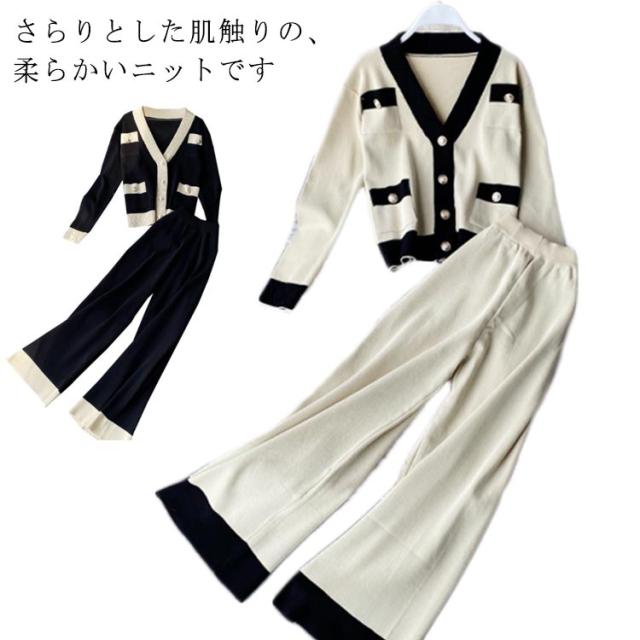 ニットセットアップ レディース 長袖 2点セット ジャケット ロングパンツ ワイドパンツ Vネック ニットカーディガンン ニットジャケット ニットパンツ バギーパンツ パンツスーツ 細見え 美脚 OL お出かけ ins 韓国